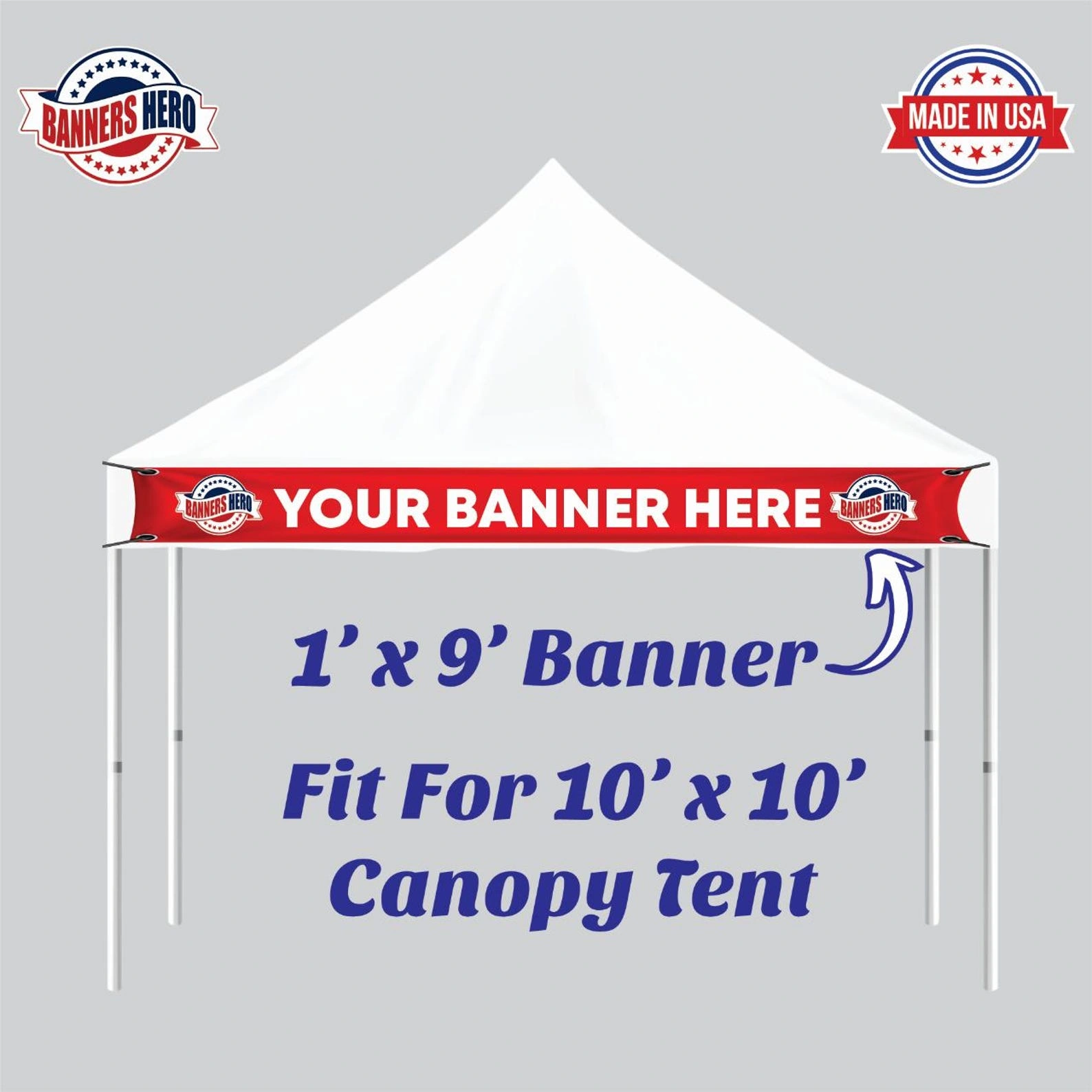 - Front Banner: 1′ x 9′ (designed for the outside front of your canopy)
