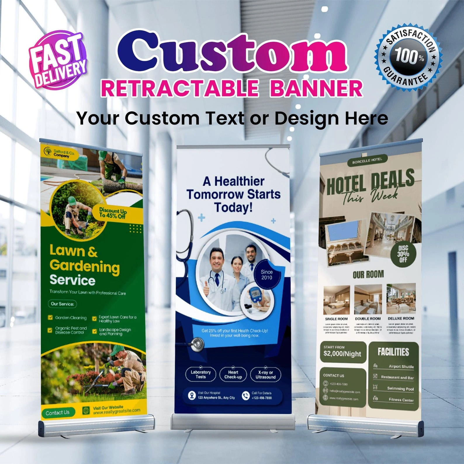 Showcase your brand in style with our custom retractable banner stands! Perfect for trade shows, business events, retail stores, exhibits, and promotional displays, this banner stand is lightweight, portable, and easy to set up. When not in use, the banner retracts smoothly into the durable aluminum base for safe storage.