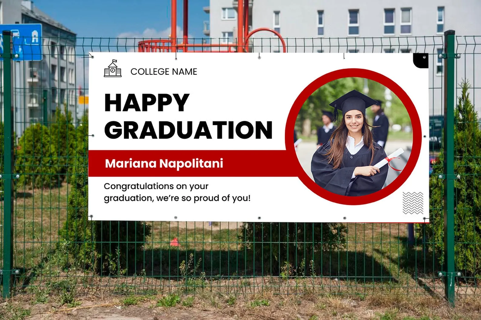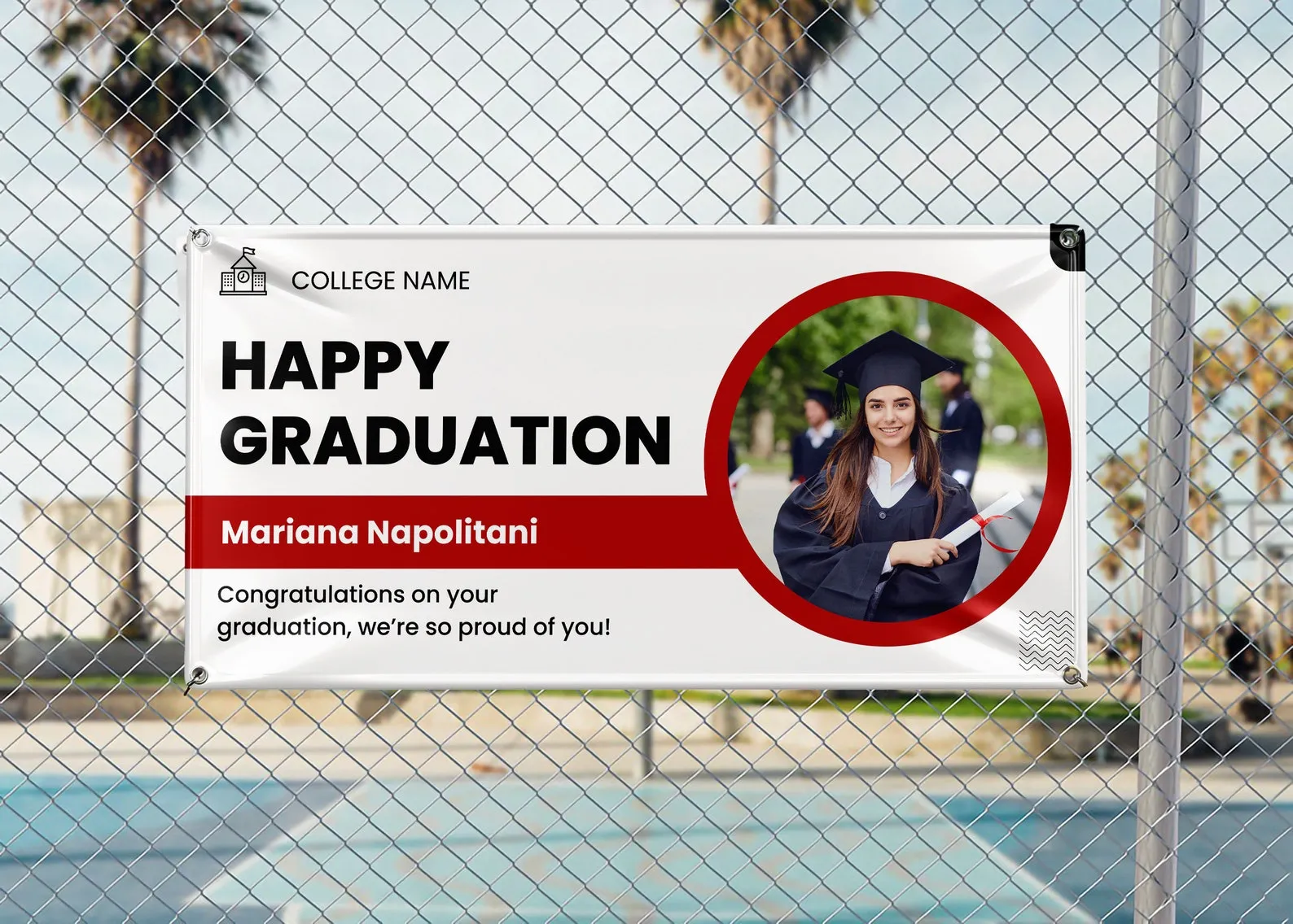 For graduation banner, we recommend ordering 1 size down from the size of your tent (i.e. if your tent is 10’x10′ we would recommend a 9’x1′ banner).